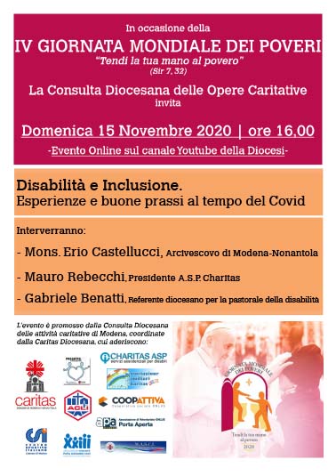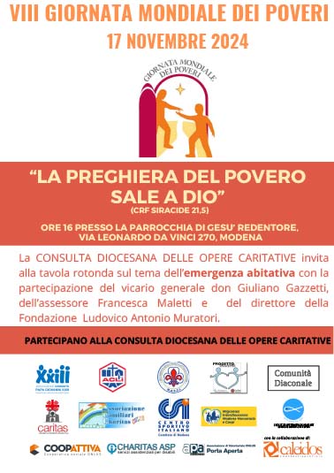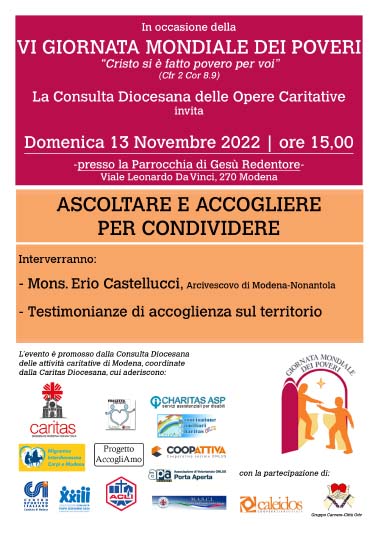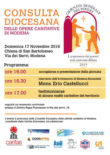 La Consulta delle opere Caritative e Assistenziali della Diocesi di Modena-Nonantola è nata nel 2017 su forte impulso del nostro Vescovo Erio Castellucci, per promuovere la costruzione di una rete tra le diverse opere caritative di espressione cristiana e favorire lo scambio di informazioni e competenze, al fine di potenziare il lavoro di inclusione sociale sul territorio. Caritas Diocesana ha assunto il ruolo di coordinamento della rete promossa dalla Consulta che al momento riunisce: Caritas Diocesana, Coopattiva, Gruppo Masci, Progetto Insieme, CSI Modena, Acli, Associazione Comunità Papa Giovanni XXIII, Charitas ASP, Associazione familiari Charitas, Associazione Porta Aperta, Associazione San Vicenzo de’ Paoli, Comunità Diaconale, Migrantes, Servizio interdiocesano per la pastorale delle persone con disabilità, con la collaborazione di Caleidos.